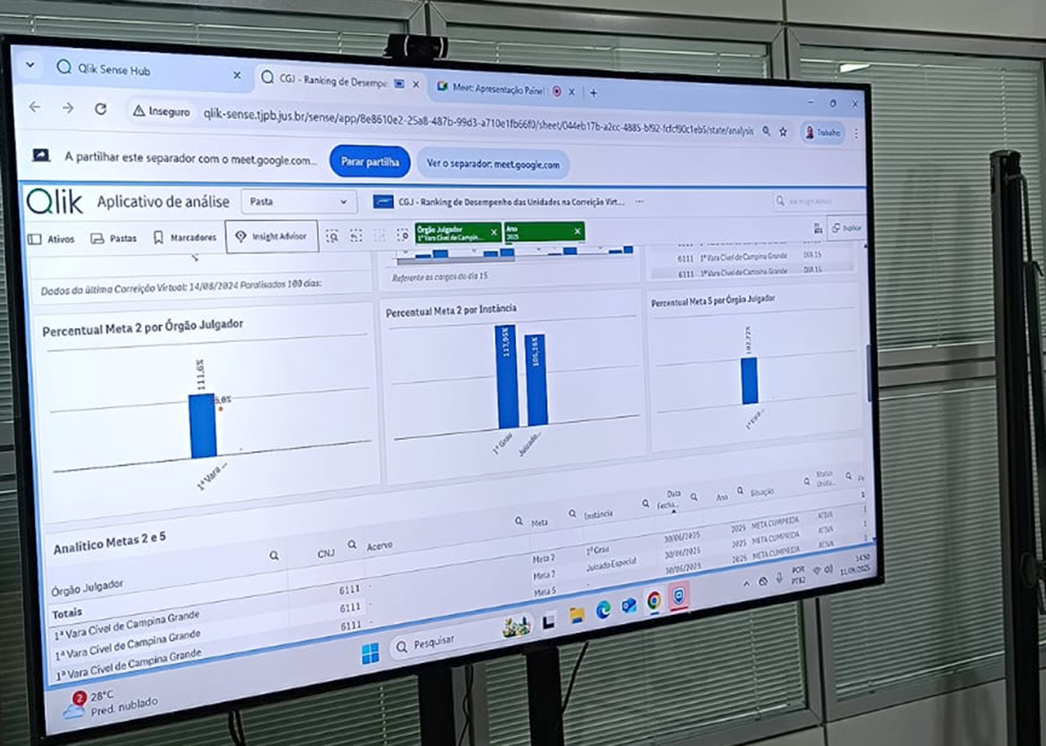 A Corregedoria-Geral da Justiça da Paraíba (CGJ-PB) deu mais um passo importante no fortalecimento da gestão e acompanhamento das atividades jurisdicionais. Em reunião realizada com os juízes corregedores e auxiliares, na tarde dessa quinta-feira (11), a Gerência de Tecnologia da Corregedoria apresentou o ‘Painel de Business Intelligence (BI) da Correição Virtual’, ferramenta que permite visualizar de forma clara e objetiva os principais indicadores de desempenho das unidades judiciais.